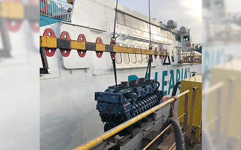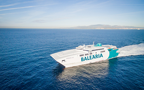 The Avemar Dos catamaran was built in 1996 by the Austal shipyard in Australia. It went into service in 1997 and following several changes of owner was taken over by ferry operator Balearia in 2008. It originally served the Strait of Gibraltar route between Algeciras and Ceuta. Now the new repowered ferry plies beween the mainland port of Denia and the Balearic islands of Ibiza and Majorca. The 82-m ferry can accommodate 855 passengers and 174 vehicles.