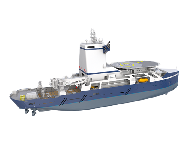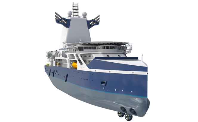 The design has been developed with particular focus on the special requirements valid for the Norwegian Continental Shelf, and also for further work in more northern harsh and cold environments. This tailor-made vessel will incorporate an enclosed module handling tower to ensure a safe and comfortable working environment for the crew while operating in harsh and cold conditions. The Ice-class vessel will have DP3 dynamic positioning and comfortable accommodation for 91 people. The propulsion system is based on a diesel electric generating system with azimuthing propulsion system.